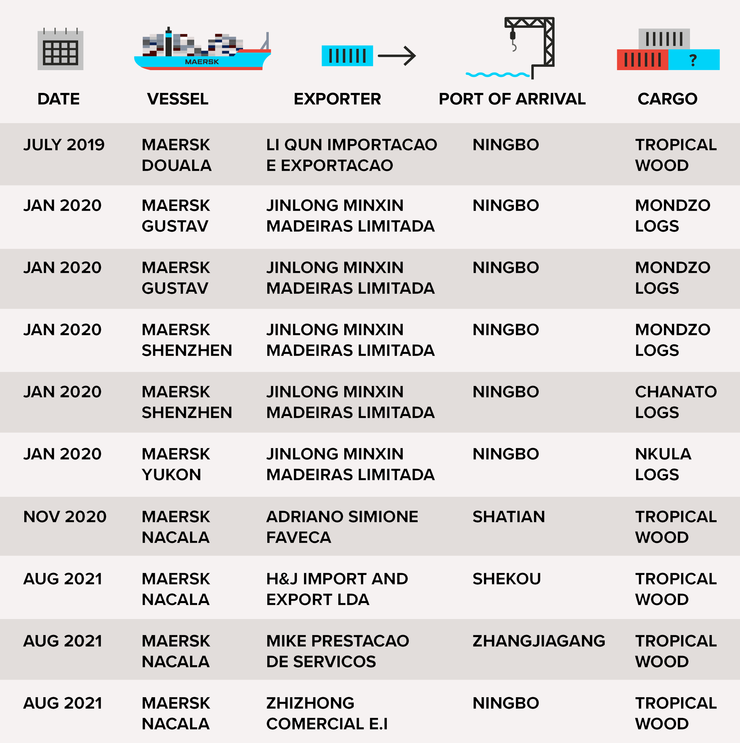 The month before, in January 2020, two other Maersk ships had also arrived in Ningbo with a total of just under 4,000 tonnes of illegal Mozambican timber.